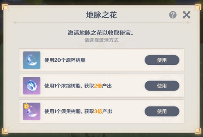 4、刷20體的地脈/秘境可以選擇消耗須臾樹脂,一次性獲得3倍獎(jiǎng)勵(lì)(以后重復(fù)刷本就不用捏完樹脂回去合成濃縮后再回來(lái)刷了)