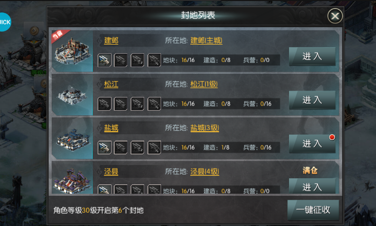 封地是在世界上面的城池上面封的,城池等級越高對封地建筑的提升越高。封地每五級開啟一個新的封地。封地建筑分為兵營,農田,木廠,銅礦廠四種,分別對應練兵,糧食,木頭與銅錢。農場,木廠,銅礦建筑等級越高產量與儲存上線越高。建筑等級越高和產出的數(shù)量成正比。