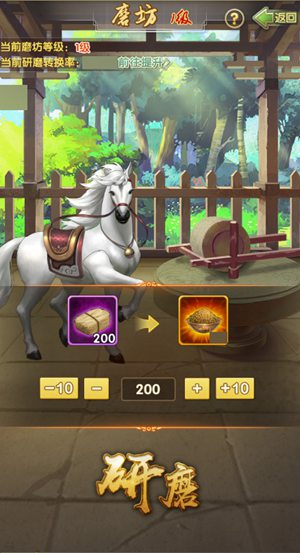 磨房是資源型建筑,掌門可在磨房中將草料研磨成飼料供養(yǎng)坐騎。升級磨房,可提高研磨的轉換率,使得草料研磨成更多的飼料。鑄幣廠也是資源型建筑,掌門可在鑄幣廠中將鑌鐵鑄造成相馬幣,在馬市中使用。同樣,升級鑄幣廠可提高鑄造轉換率,使得單位鑌鐵鑄造成更多的相馬幣。