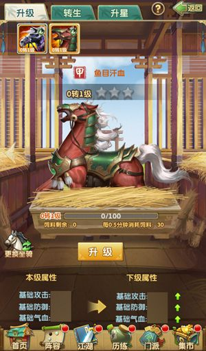 坐騎的升級是掛機式的玩法,只要飼料充足,養(yǎng)在馬廄中的坐騎就會隨時間得到經驗。前面也提到了,當升級到一定級數(shù),坐騎必須轉生才可繼續(xù)獲得經驗升級。而坐騎的轉生,需要消耗同等級的坐騎作為材料。因此,當陣上的坐騎已經滿級,需要轉生的時候,掌門可以將馬廄的位置用于升級材料馬,這樣才能最大化的提升坐騎的等級。