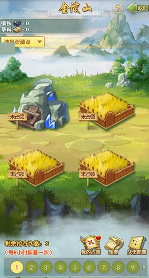 配合蓄馬場的出現(xiàn),金陵山的相關玩法也開啟了。游戲中,掌門可在金陵山中通過占領資源點獲取資源,而資源點分為鐵礦場和草料場兩種,鐵礦場生產鑌鐵,草料場生產草料。需要注意的是,每個弟子最多只能占領兩個資源點,搶奪和防守都會以隊伍為單位進行,掌門需要合理分配隊伍,一個隊伍最多放置3名弟子。