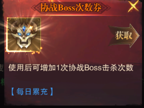 BOSS疲勞:可以通過消耗協(xié)戰(zhàn)BOSS次數(shù)券來恢復(fù)疲勞。當前只能通過每日累充來獲取。獲取途徑比較有限,但建議每天都拿到。