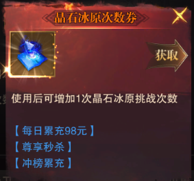 挑戰(zhàn)機會:成為SVIP后可以通過花費20泰坦幣來購買多1次挑戰(zhàn)機會。也可以使用晶石冰原次數(shù)券來增加挑戰(zhàn)次數(shù)。晶石冰原次數(shù)券獲得的途徑比較多,