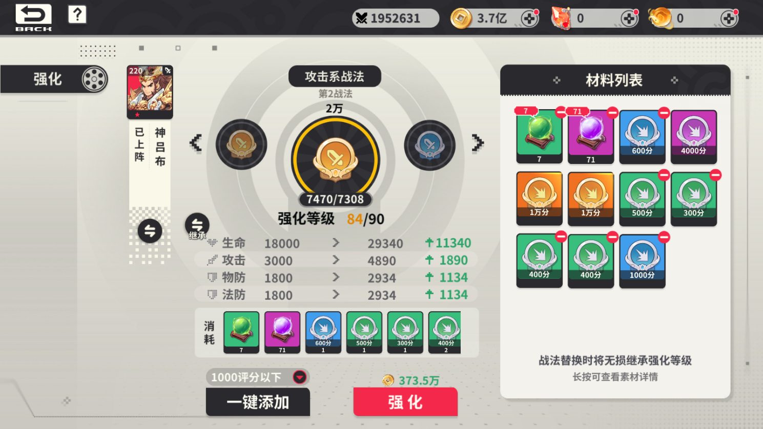 武將技能需要領(lǐng)悟戰(zhàn)法后激活,不同類型武將需要使用對(duì)應(yīng)的戰(zhàn)法類型,戰(zhàn)法可培養(yǎng)升級(jí),升級(jí)增加戰(zhàn)法基礎(chǔ)屬性;戰(zhàn)法評(píng)分大于或等于五萬(wàn)分可傳承。
