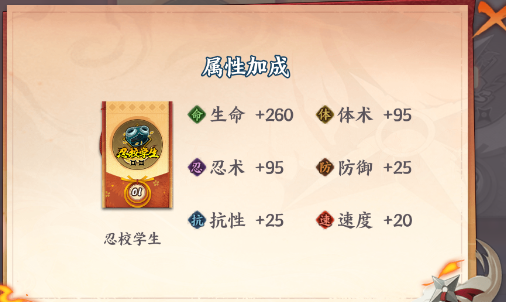 上陣同屬性的5個忍者:生命+25% 體術+20% 忍術+20%