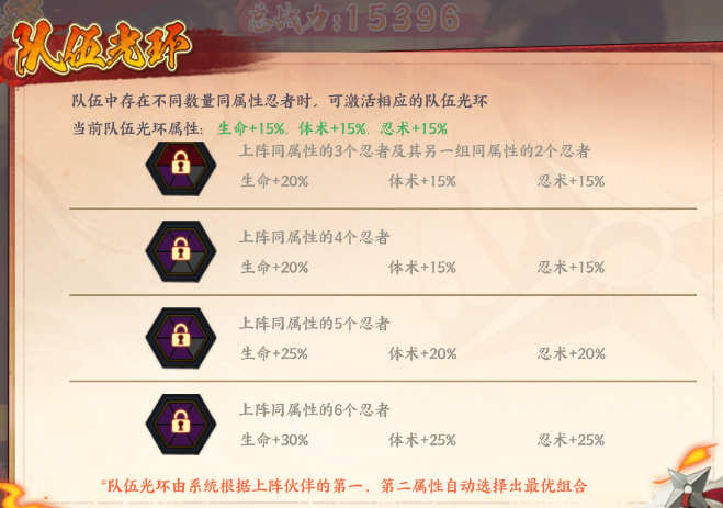 上陣同屬性的3個忍者及其另一組同屬性的2個忍者:生命+20% 體術+15% 忍術+15%