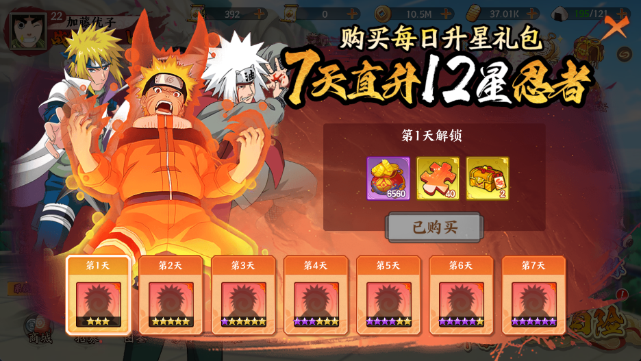 第一天有:元寶*6560、SSS萬能碎片、SSS卡包三選一(自來也、波風水門、一尾鳴人)*2