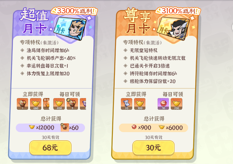 2.月卡&超值月卡:月卡和超值月卡不僅提供每日可領(lǐng)取的元寶和戰(zhàn)船藏品,同時還能夠加速戰(zhàn)斗和免除廣告;最重要的時,在前期體力溢出時,可以通過機(jī)關(guān)飛輪快速掃蕩領(lǐng)取大量養(yǎng)成資源,進(jìn)度上快人一步