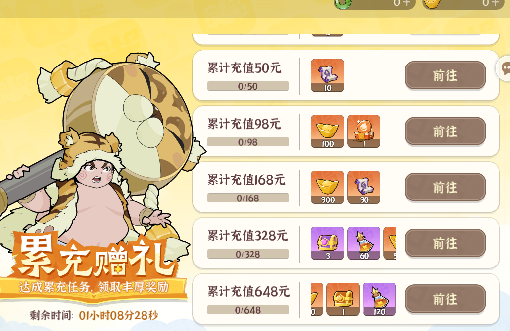 根據(jù)當(dāng)前累充額度距離下一檔累充獎勵的差值,可以選擇購買一些小額禮包積攢累充進(jìn)度,白拿一檔獎勵