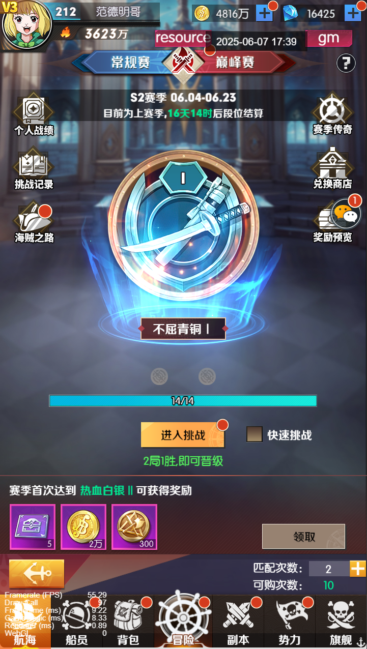 1.?每周六開啟天梯排位,每天獲取10次挑戰(zhàn)次數(shù),挑戰(zhàn)勝利可以對調(diào)排名,每日0.次數(shù)刷新。