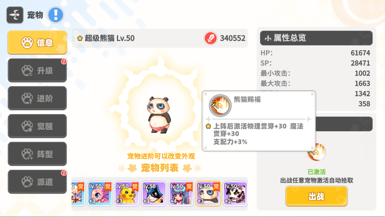5.?每個寵物上陣后將激活特殊屬性,每個寵物都擁有不同的特殊屬性