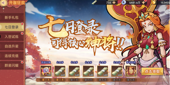 3、開服前七日領(lǐng)取豐富獎勵,第七天再送神將自選