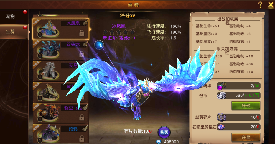 坐騎:每只坐騎都會(huì)為玩家?guī)砩?、物防、魔防、物攻、攻、防御穿透的屬性提升,坐騎品質(zhì)越高,提升越大。玩家可通過坐騎的升級(jí)以及升星來提升坐騎的屬性。
