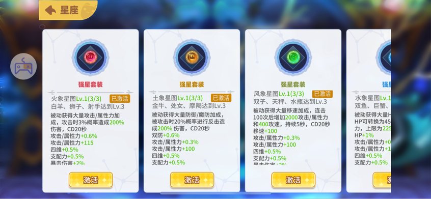 同時(shí)星座玩法還有星圖一個(gè)很重要的提升方面。每個(gè)象限的三個(gè)星座同時(shí)達(dá)到3級(jí),6級(jí),9級(jí),12級(jí),15級(jí),18級(jí),21級(jí),24級(jí),27級(jí),30級(jí)后可以激活獲得額外屬性加成。
